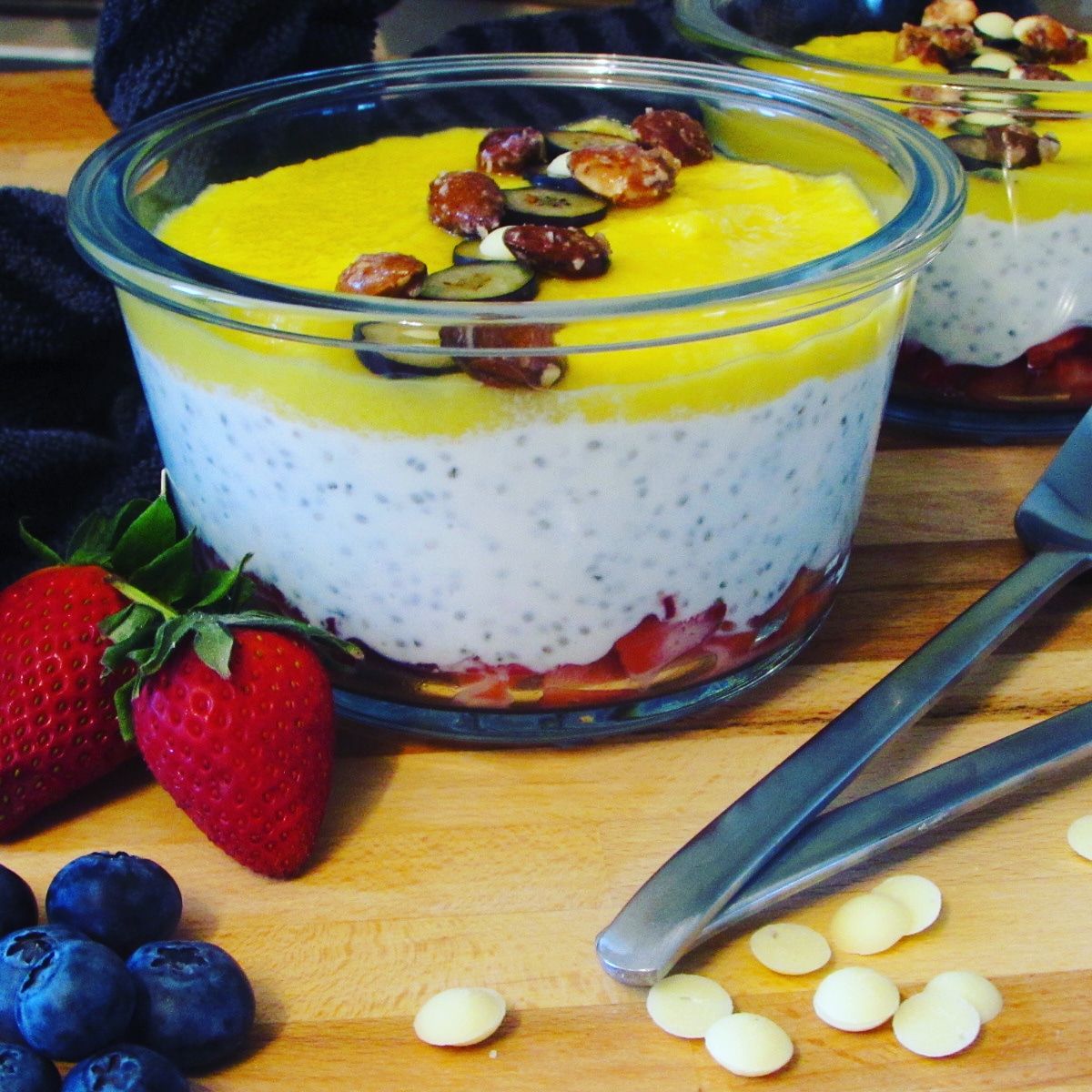 - Chiasamen mit dem Joghurt gut verrühren und zur Seite stellen (je nach Belieben kann es mit flüssigem Süßstoff gesüßt werden).